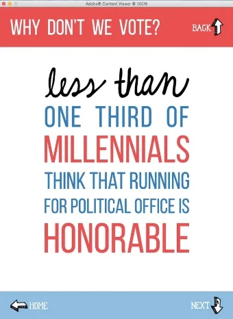 This app was created to call attention to the issues with the "millennial vote" and inspire users to be engaged and aware of their local and national elections. This project allowed me to research something I am passionate about and explore simple motion graphics and hand lettering. A video walkthrough of the app can be seen below.